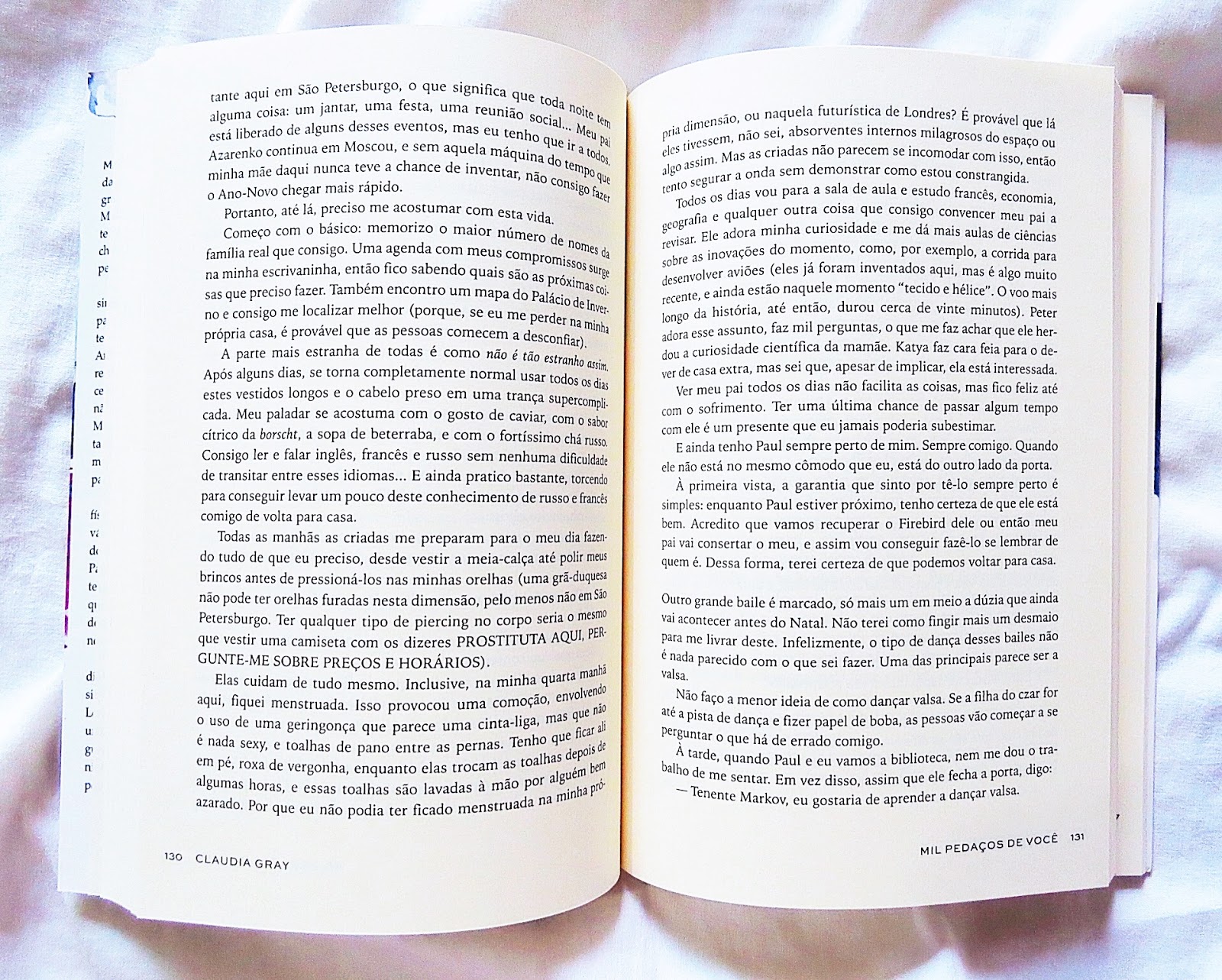 são amareladas, a fonte é okay. Eu amei a capa, adorei ver São Petersburgo na